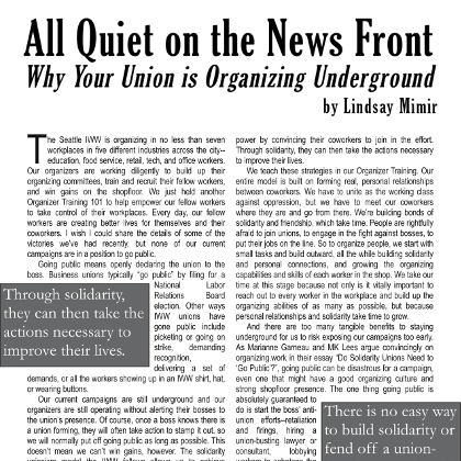 The Seattle IWW is organizing in no less than seven workplaces in five different industries across the city education, food service, retail, tech, and office workers. Our organizers are working diligently to build up their organizing committees, train and recruit their fellow workers, and win gains on the shopfloor. We just held another Organizer Training 101 to help empower our fellow workers to take control of their workplaces. Every day, our fellow workers are creating better lives for themselves and their coworkers. I wish I could share the details of some of the victories we’ve had recently, but none of our current campaigns are in a position to go public.